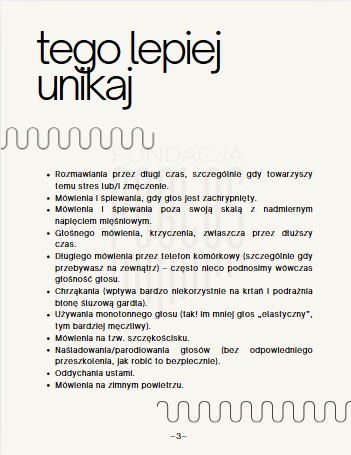 „Higiena głosu” to praktyczny, krótki przewodnik dla wszystkich, którzy chcą świadomie dbać o swój głos – niezależnie od tego, czy pracują nim zawodowo, czy po prostu chcą mówić i brzmieć swobodniej. To także materiał edukacyjny, którego lekturę możesz zalecić swoim podopiecznym. Dowiesz się z niego, jakie układy w ciele są powiązane z głosem oraz jakie działania w związku z tym możemy podjąć aby od zaraz zadbać o głos, znajdziesz również informacje jakie zachowania i strategie wspiarają tworzenie dźwięku, a jakie mogą być dla tego procesu niekorzystne.